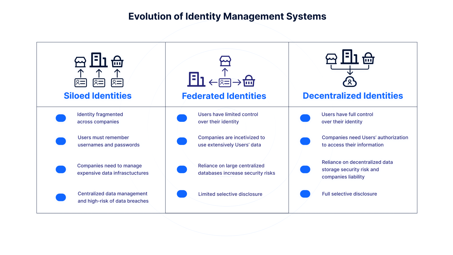 This is a legacy system where identities are scattered across various companies. The drawbacks are clear: users juggle multiple credentials, and companies bear the high cost of managing data infrastructures. Plus, the centralized approach to data management leads to significant security vulnerabilities. Siloed Identities. In this archaic model, each company holds a separate fragment of the user's identity. This fragmentation leads to a cumbersome experience for users, who must remember a plethora of usernames and passwords, a true hassle in our digital world. Companies aren't spared either; they face the daunting task of maintaining secure, yet costly data infrastructures. Centralized data storage compounds the problem, posing a high risk of catastrophic data breaches.